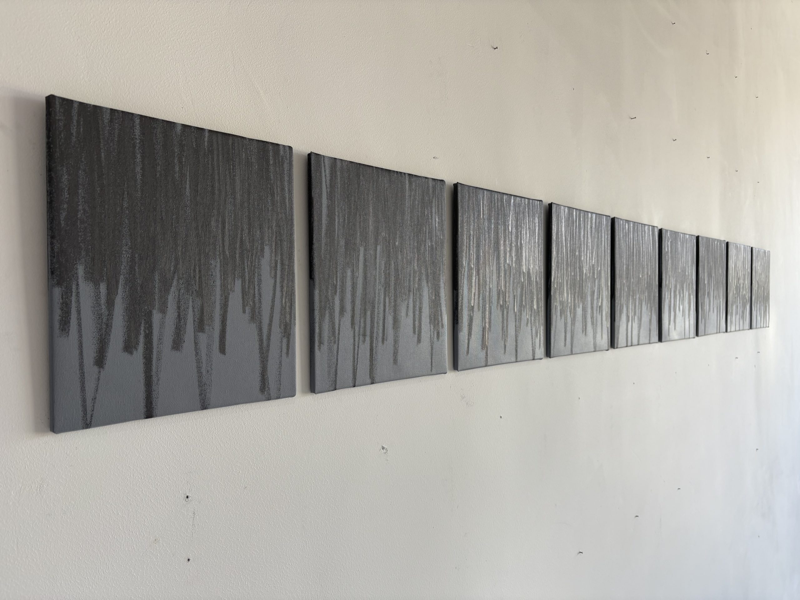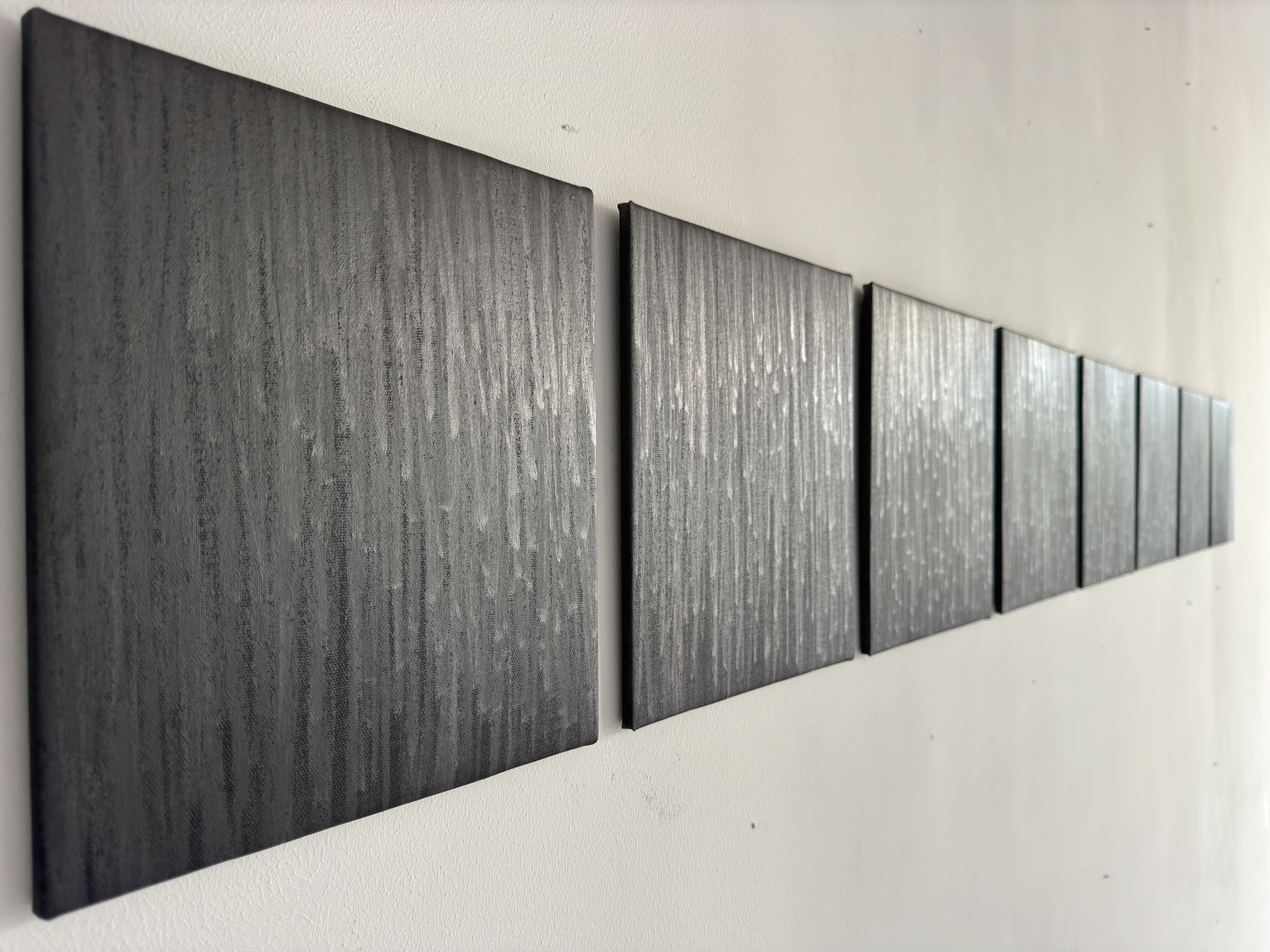 4 gestes superposés sur fond gris, mine terne et irisée, 2022, graphite, acrylique, toile, 28 x 25 cm.