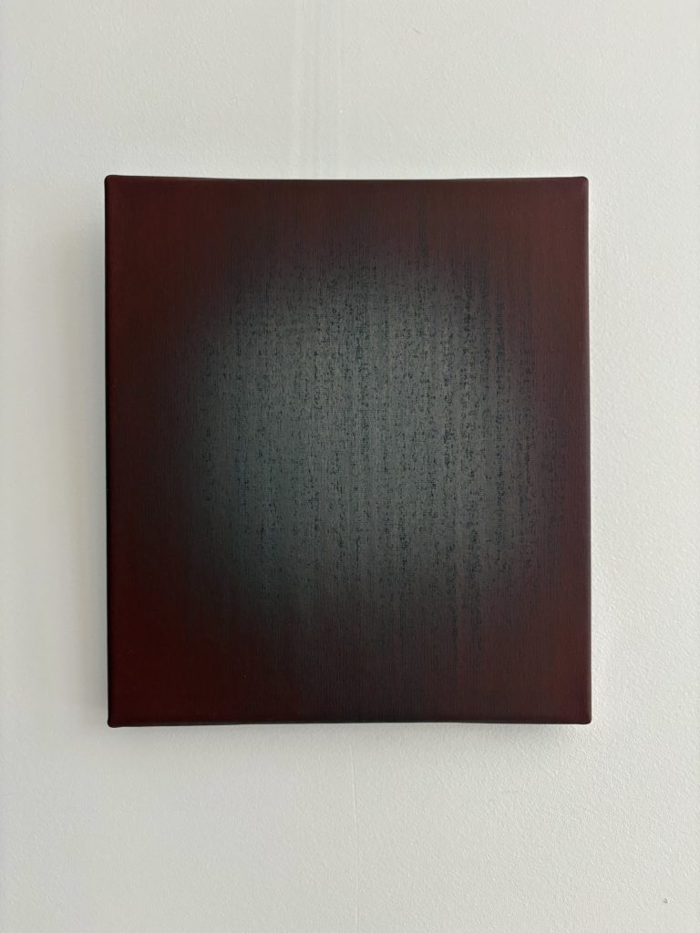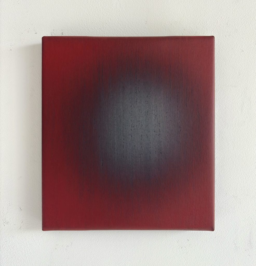 Persistances, 2025, rouge de cadmium très foncé, graphite et acrylique sur toile, 28 x 25 cm.