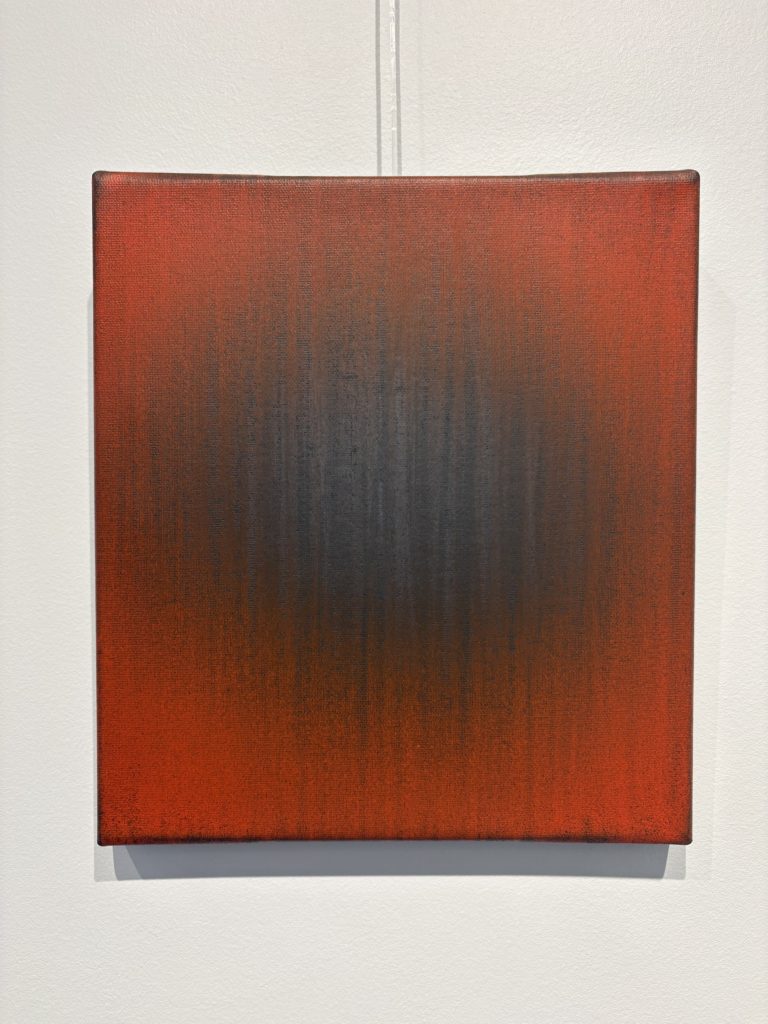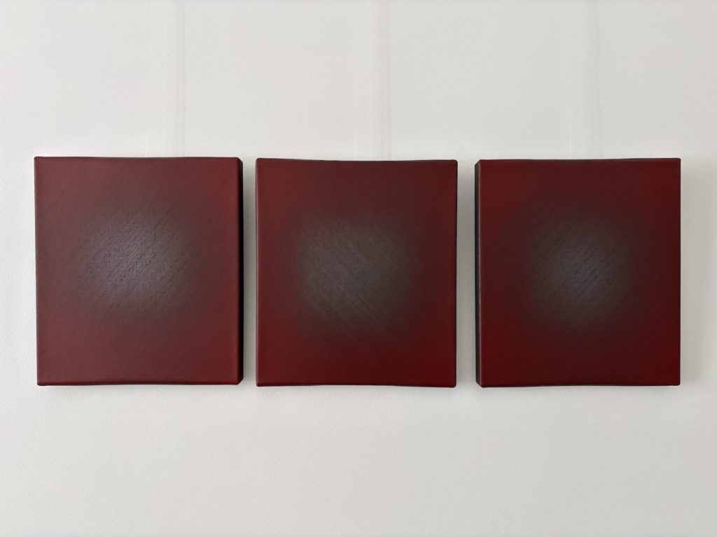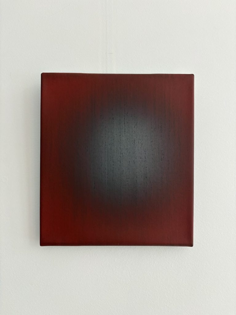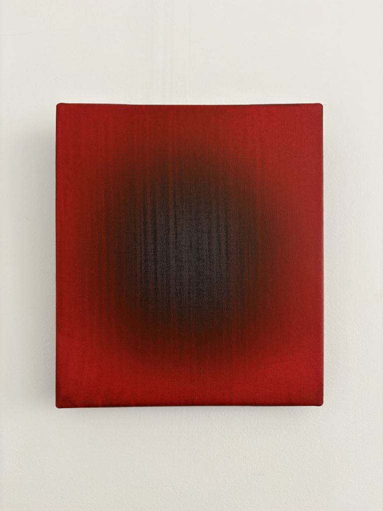 Persistances, 2025, rouge de cadmium foncé, graphite et acrylique sur toile, 28 x 25 cm.